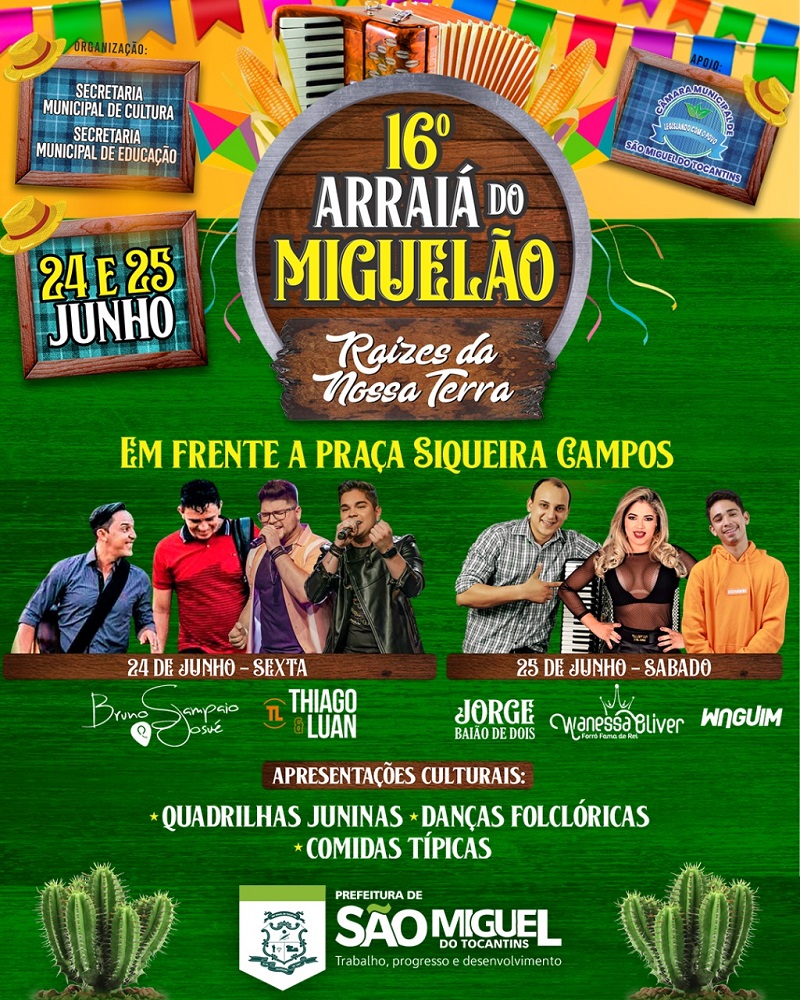 A prefeitura de São Miguel, município no Bico do Papagaio, realizará nos dias 24 e 25 de junho o 16ª Arraiá do Miguelão com o tema “Raízes da Nossa Terra”. A festa acontecerá em frente à praça Siqueira Campos, no centro do município a partir das 19h.