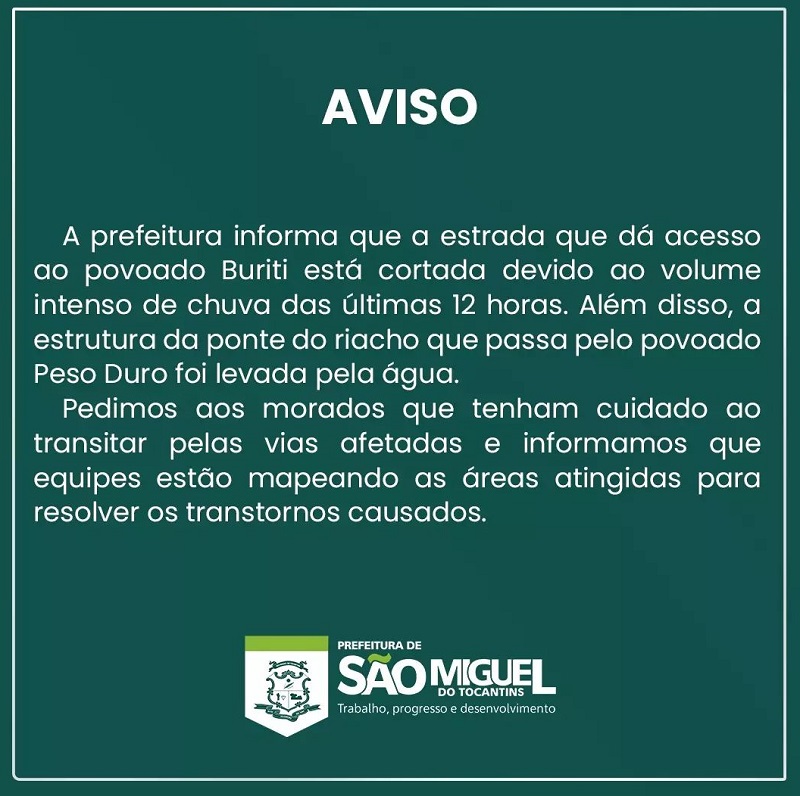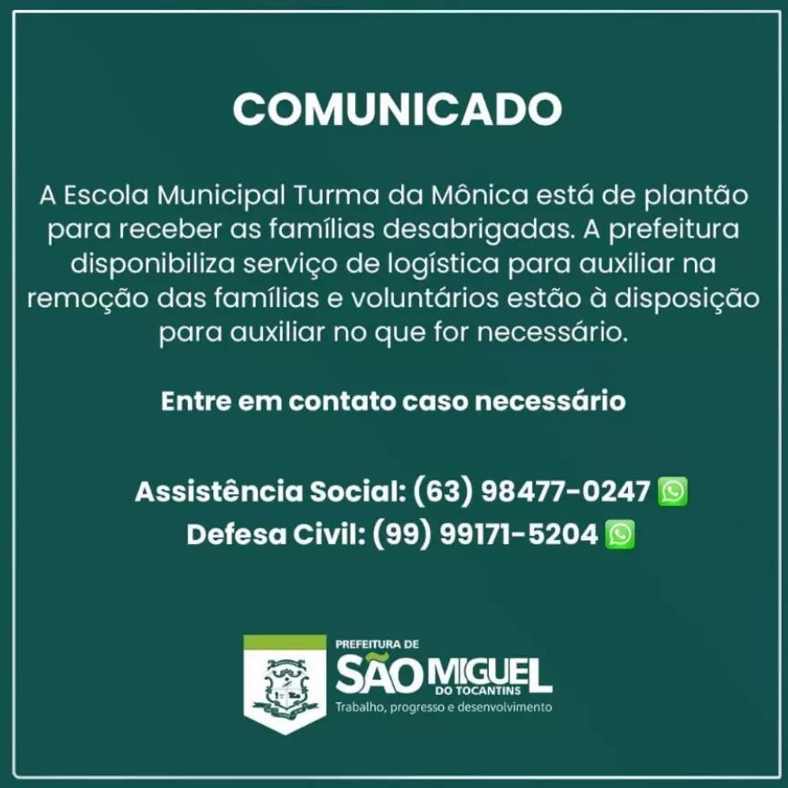 São Miguel fica às margens do rio Tocantins, na divisa com o Maranhão. Com a cheia do rio, muitas famílias tiveram as casas alagadas e precisaram sair de casa. A cidade tem 404 pessoas atingidas, sendo que 198 pessoas estão desabrigadas. Os alojamentos improvisados na cidade já estão lotados.