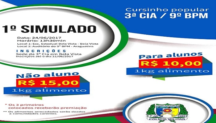 No dia 24, sábado, estará acontecendo o 1º simulado em alusão ao cursinho popular realizado pela 3ª Companhia Operacional do 9º Batalhão da PM em Bela Vista, sede da Cia, município de São Miguel. De acordo com a programação elaborada pelo comandante da Companhia em Bela Vista, capitão José Carlos da Costa Abreu, os alunos realizarão o simulado que acontecerá às 13h30min em dois locais diferentes.