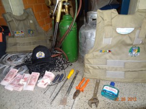 Ao realizarem busca nos autores e no interior do Gol, a Polícia Militar encontrou um botijão de gás, um maçarico, uma extensão, três chaves de fenda, um alicate, uma chave de boca, uma corda, uma talhadeira, uma mochila com roupa e materiais higiênicos, bem como, a quantia de R$ 5.030,00 (cinco mil e trinta reais em dinheiro).