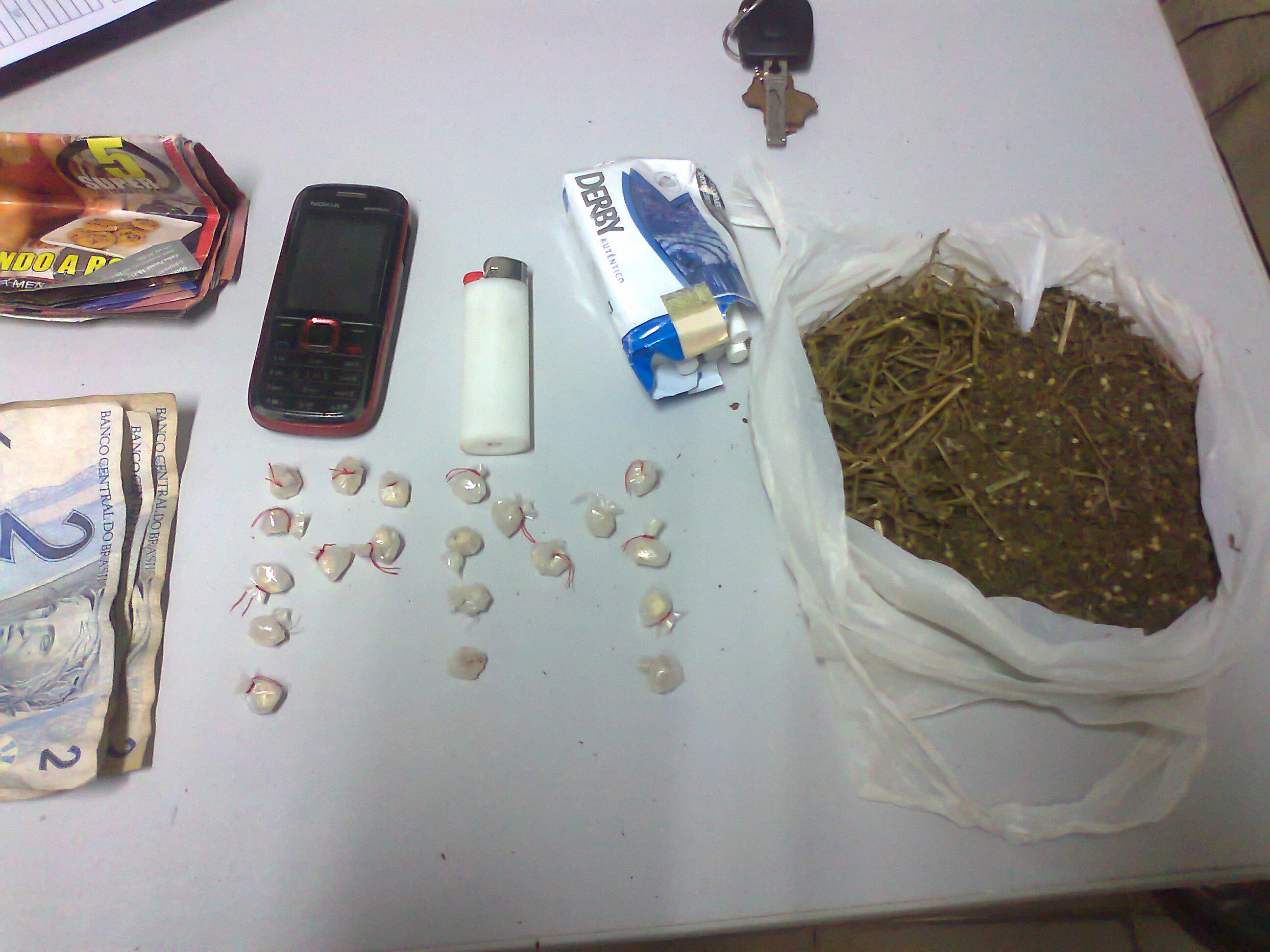 Junto com os mesmos em um barraco abandonado, foram encontrados 01 arma branca, 20 (vinte) pedras de crack, cerca de 250 (duzentos e cinqüenta) gramas de maconha e ainda a quantia de R$ 6,00 (seis reais). As pedras de crack estavam embaladas individualmente, prontas para serem comercializadas.
