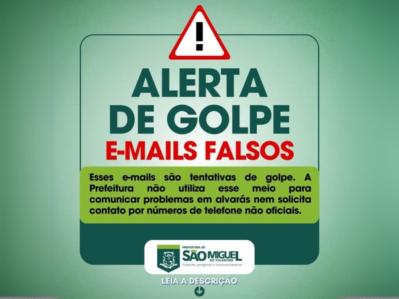 A Prefeitura Municipal de São Miguel do Tocantins, no Bico do Papagaio, está alertando a população sobre uma nova modalidade de golpe que tem como alvo fornecedores da administração pública. Criminosos estão enviando e-mails falsos em nome da Prefeitura, comunicando supostas irregularidades em alvarás de funcionamento e solicitando contato por meio de números de telefone não oficiais.
