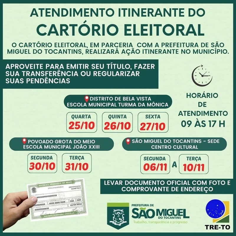 A Justiça Eleitoral inicia nesta quarta-feira, 25 de outubro, uma ação itinerante que se estenderá até o dia 10 de novembro. O município de São Miguel, localizado na região do Bico do Papagaio, será o centro dessa ação, que também abrangerá os povoados de Bela Vista e Grota do Meio.