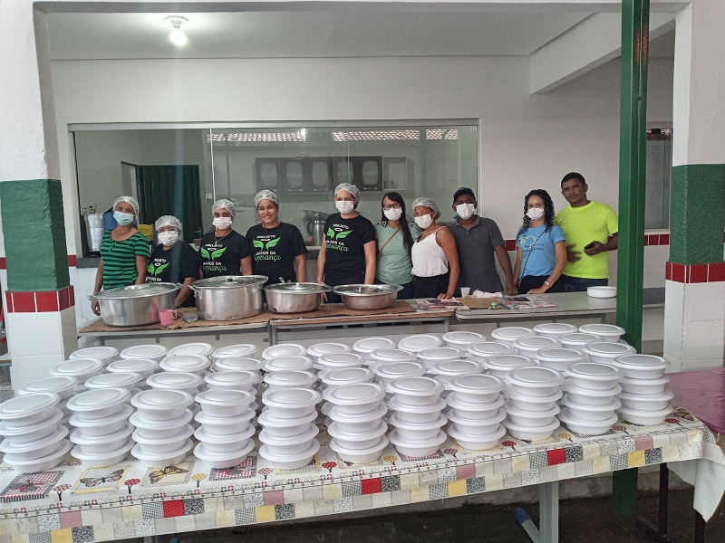 Merendeiras e voluntários estão cozinhando na Escola Municipal Turma da Mônica as marmitas que são distribuídas para as famílias. “Todos os dias está sendo oferecido o café da manhã, o almoço e o jantar na escola Turma da Mônica, tanto para as famílias alojadas no local como também para aqueles que estão em outros abrigos, mas não têm condições de fazer o alimento”, explica Marcivanne.