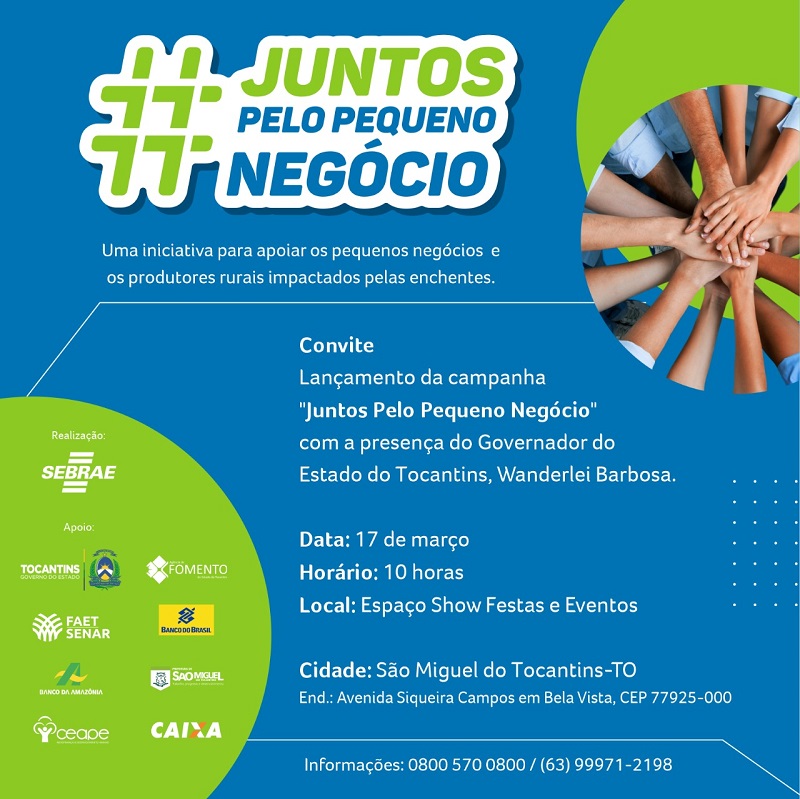 “Juntos pelo pequeno negócio” é uma iniciativa do Sebrae Tocantins para apoiar os pequenos negócios e os produtores rurais de municípios impactados pelas enchentes. O lançamento da campanha acontece nesta quinta-feira (17), às 10h, em São Miguel, região do Bico do Papagaio e contará com a presença do governador Wanderlei Barbosa, gestores municipais e parceiros.