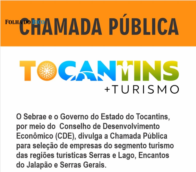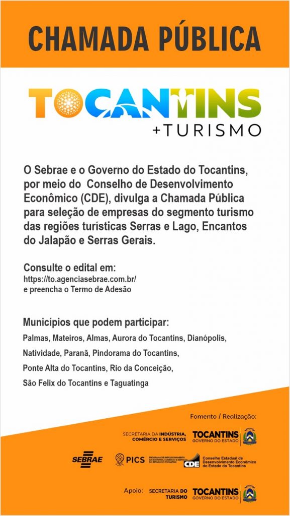 O edital de abertura da chamada pública para seleção de empresas do segmento turismo das regiões turísticas: Serra e Lago, Encantos do Jalapão e Serra Gerais está aberto. A iniciativa faz parte do projeto Tocantins + Turismo, lançado em março deste ano pelo Sebrae e Governo do Estado.