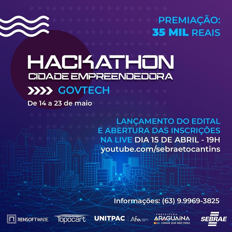 O Sebrae Tocantins lançará nesta quinta-feira, 15, às 19h, em live no Youtube o edital do Hackathon Cidade Empreendedora – Govtech, com prêmio total de R$35 mil para os melhores projetos de soluções tecnológicas para municípios e órgãos de governo. O Hackathon é realizado pelo Sebrae em parceria com a Prefeitura de Araguaína, Unitpac Araguaína, Topocart e Rensoftware.