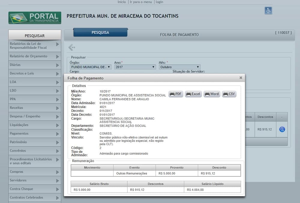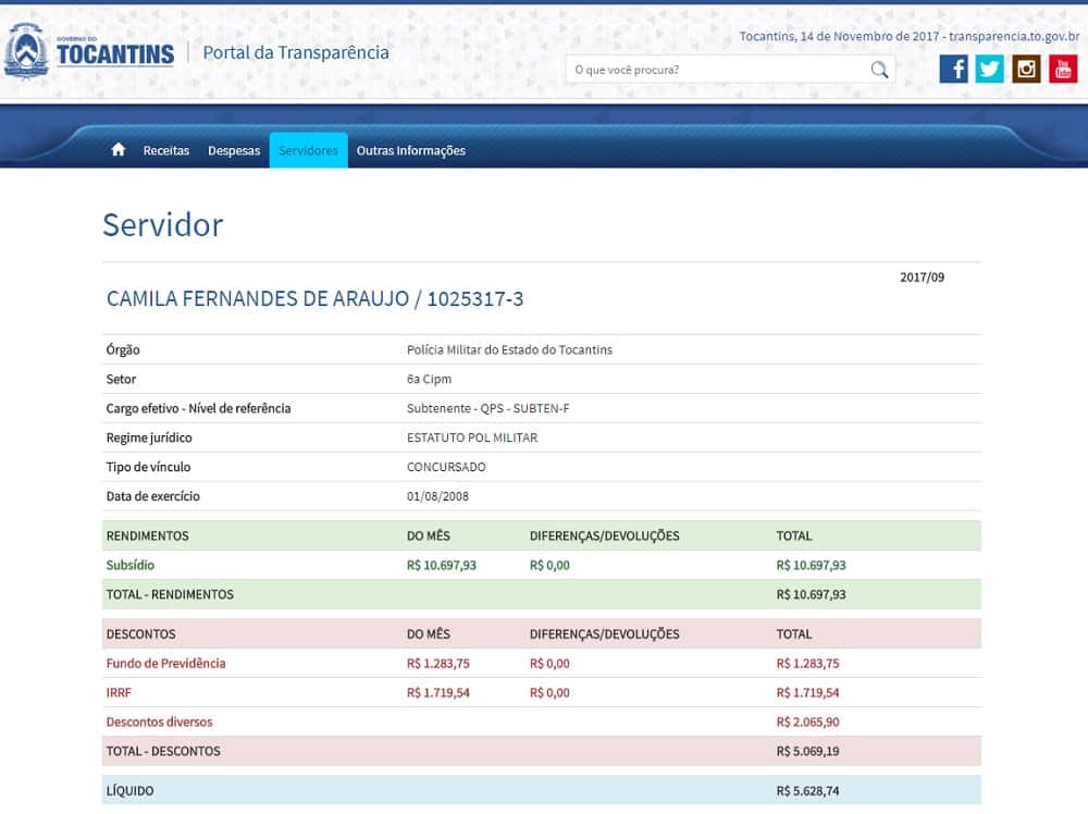 O Portal da Transparência da Prefeitura de Miracema e da Polícia Militar, detalham o pagamento dos dois vencimentos, mas não mostra os horários de expediente. Como secretária municipal, Camila fatura R$ R$ 5 mil brutos, já na PM o salário bruto é de R$ 10.697,93. Os dois juntos somam mais de R$ 15 mil.