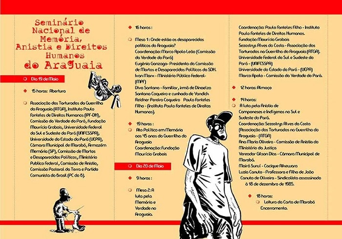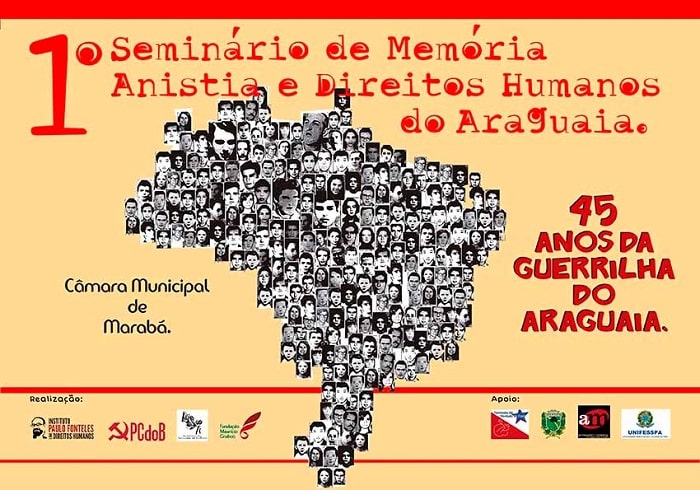 A Universidade Federal do Sul e Sudeste do Pará (Unifesspa), o Instituto Paulo Fonteles de Direitos Humanos, Associação dos Torturados na Guerrilha do Araguaia e a Fundação Maurício Grabois, parceiros ligados à área de direitos humanos no âmbito nacional, estadual e local promovem nos dias 19 e 20 de maio de 2017, na Câmara Municipal de Marabá, o 1º Seminário Nacional de Memória, Anistia e Direitos Humanos do Araguaia.