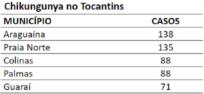 O número de casos de Chikungunya é maior em Araguaína do que em qualquer outra cidade do estado. No ranking, ela é seguida por Praia Norte, Colinas, Palmas e Guaraí. Chama atenção a presença de Praia Norte na lista, a cidade tem pouco mais de 8,2 mil moradores e é a menor entre todas que aparecem nas três listas.