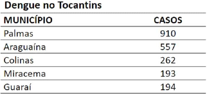 Das três doenças ligadas ao mosquito, a dengue é a que está presente há mais tempono Brasil. A Prefeitura de Palmas afirma que o número de notificações de casos suspeitos caiu entre 2016 e 2017, mas a cidade ainda lidera em número de casos. Ela é seguida por Araguaína, Colinas do Tocantins, Miracema do Tocantins e Guaraí. As cinco cidades estão concentradas na região centro-norte do estado.