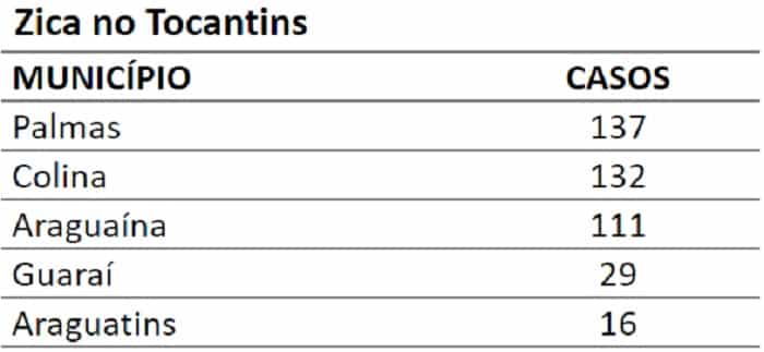 Os casos de Zika são preocupantes especialmente para as gestantes, uma vez que a doença está ligada com o desenvolvimento da microcefalia em bebês. Palmas tem a maior quantidade de casos desta doença no estado, seguida por Colinas, Araguaína, Guaraí e Araguatins.