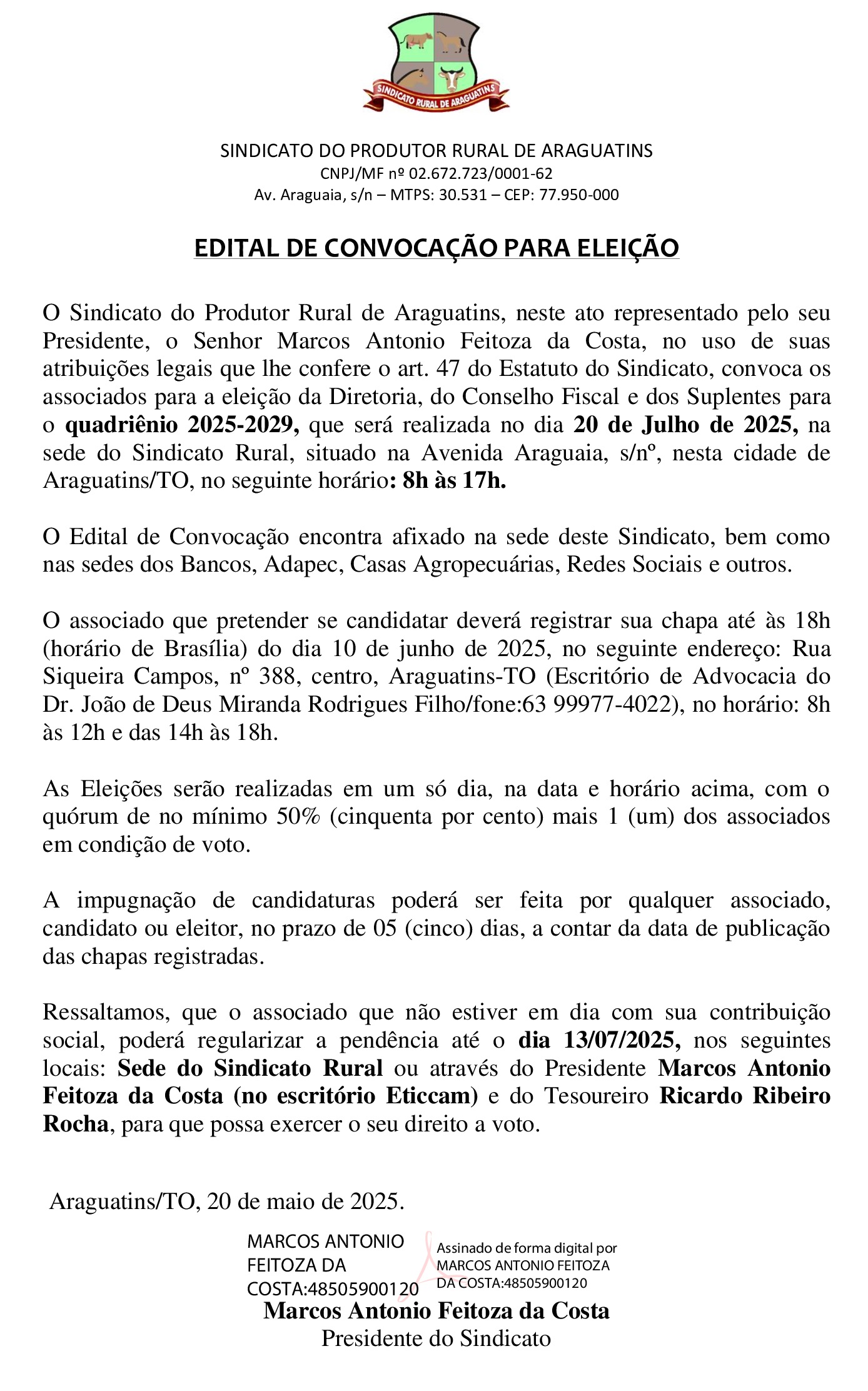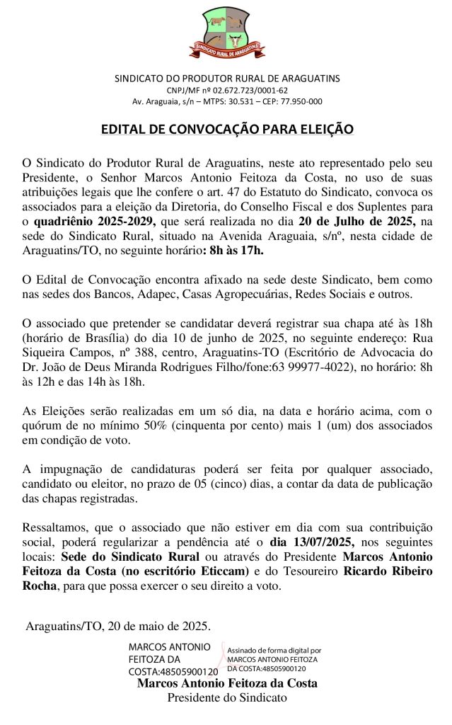 Publicidade Publicidade Geral SINDICATO DO PRODUTOR RURAL DE ARAGUATINS-TO – EDITAL DE CONVOCAÇÃO PARA ELEIÇÃO By Folha do Bico 22 de maio de 2025 0 131 Share WhatsAppPrintTelegramFacebookTwitterCopy URL Folha do Bico Noticias Relacionadas PREFEITURA DE MAURILÂNDIA DO TO – ATO AVISO DE CONCORRÊNCIA ELETRÔNICA Nº 06/2025 – REPUBLICAÇÃO 2 de dezembro de 2025 PREFEITURA DE MAURILÂNDIA DO TO – ATO AVISO DE CONCORRÊNCIA ELETRÔNICA Nº 05/2025 – REPUBLICAÇÃO 2 de dezembro de 2025 PREFEITURA DE MAURILÂNDIA DO TO – ATO AVISO DE CONCORRÊNCIA ELETRÔNICA Nº 04/2025 – REPUBLICAÇÃO 2 de dezembro de 2025 Share WhatsAppPrintTelegramFacebookTwitterCopy URL Previous articleARAGUATINS: Sindicato Rural convoca associados para eleição da nova diretoria em julhoNext articleARAGUATINS: Sarau do Cerrado é reconhecido como Patrimônio Cultural Imaterial - Advertisement - - Advertisement - Ultimas noticias AUGUSTINÓPOLIS: Vigilante de abrigo é preso suspeito de abusar duas crianças 4 de dezembro de 2025 SÃO MIGUEL: Lixão é fechado e passa a ter acesso controlado sob novas diretrizes ambientais 4 de dezembro de 2025 ARAGUATINS: Insatisfeitos, Abmael, Chico Moura e Rafael Oliveira passam a votar com a oposição e complicam gestão Aquiles 4 de dezembro de 2025 ARAGUATINS: Com voto decisivo e comando da oposição, Airton se torna principal contraponto à gestão Aquiles 4 de dezembro de 2025