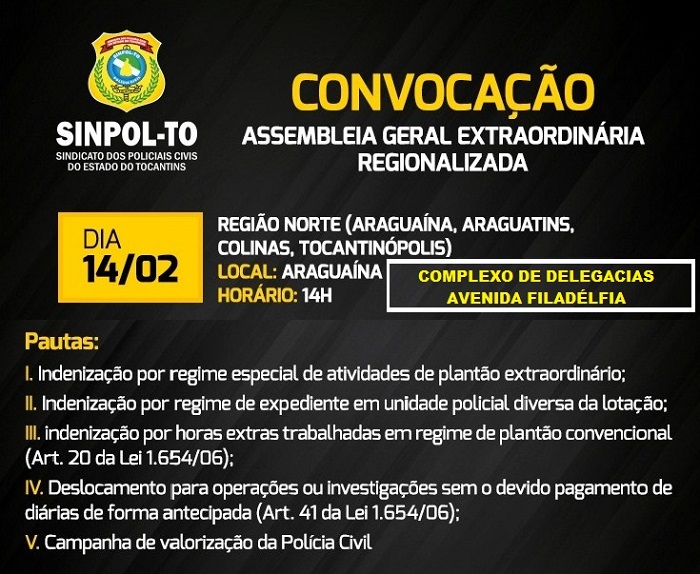 Nesta quarta-feira, 14, o Sindicato dos Policiais Civis do Estado do Tocantins (Sinpol), realiza Assembleia Extraordinária, na cidade de Araguaína, com seu filiados da região norte e Bico do Papagaio, lotados nas regionais de Araguatins, Tocantinópolis, Araguaína e Colinas.