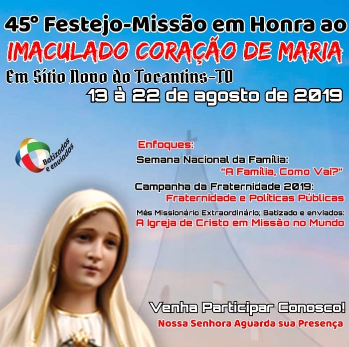 Na próxima terça, 13, começa o tradicional Festejo em Honra ao Imaculado Coração de Maria e vai até dia 22 de agosto de 2019. Os Enfoques Pastorais Evangelizadores deste ano são: Semana Nacional da Família: “A Família, como vai?”, Campanha da Fraternidade 2019: “Fraternidade e Políticas Públicas” e Batizados e enviados: “A Igreja de Cristo em missão no mundo”. A Missa Solene de abertura das festividades do Imaculado Coração de Maria será presidida pelo pároco da Paróquia Imaculado Coração de Maria padre Rusio de Sousa Brito, a partir das 19hs na Igreja Matriz Imaculado Coração.