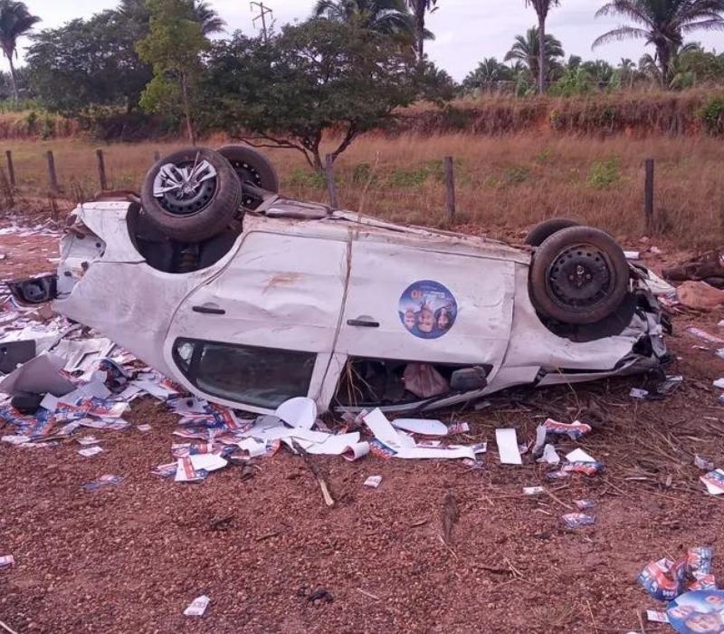 O carro, que ficou destruído, é um voyage, 2022/2023, com placas de São Paulo. Imagens mostram que as vítimas estariam a serviço de candidatos. Santinhos e adesivos ficaram espalhados às margens da via.