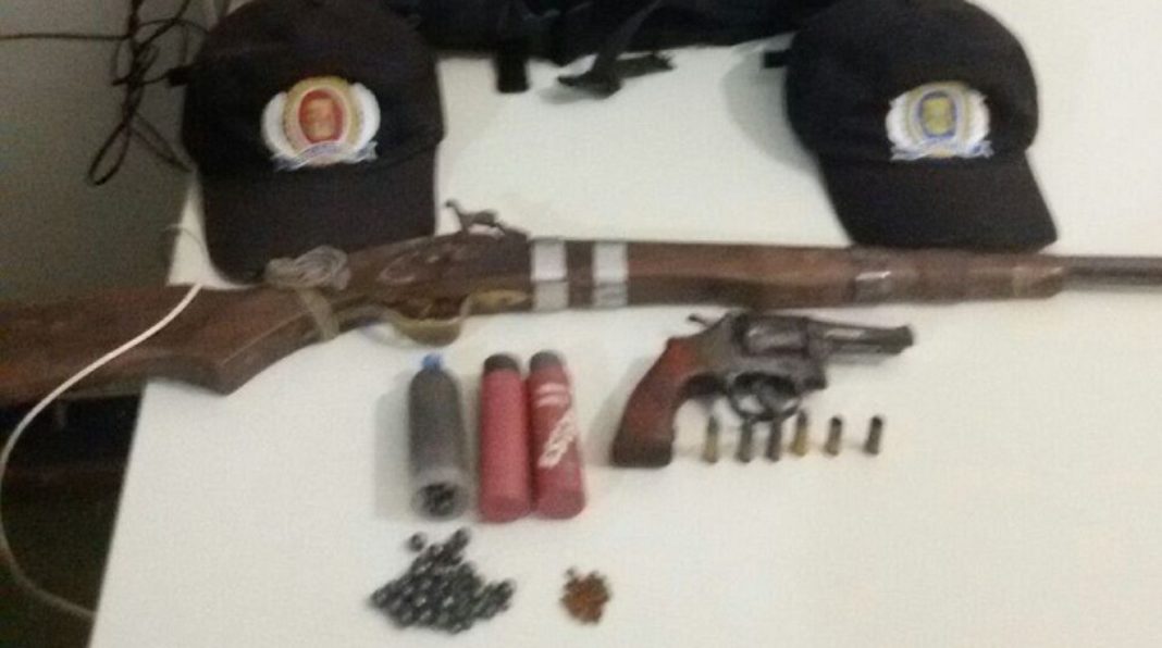 Populares disseram a PM que o idoso teria efetuado nas proximidades da casa da vítima, alguns disparos com arma de fogo e em seguida evadido do local.  Os policiais foram até a residência do idoso, onde o mesmo se encontrava escondido e efetuou a detenção dele. A PM encontrou a espingarda escondida atrás da porta da residência dele. A arma, tipo “por fora” estava municiada e com bornal contendo chumbo, espoletas e pólvora.