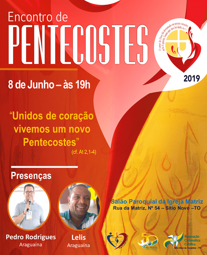Para celebrar o dia de Pentecostes, a vinda do Espírito Santo sobre os discípulos de Jesus em Jerusalém 50 dias após a Páscoa, os Católicos da Renovação Carismática de Sítio Novo – TO (RCC) realizam nos dias 8 e 9 de junho, uma programação festiva no salão paroquial da Igreja Matriz Imaculado Coração de Maria. O evento terá pregações da Palavra, momentos de louvor, de oração, de adoração e Santa Missa para celebrar a solenidade Católica de Pentecostes. As atividades iniciam neste sábado às 19h.