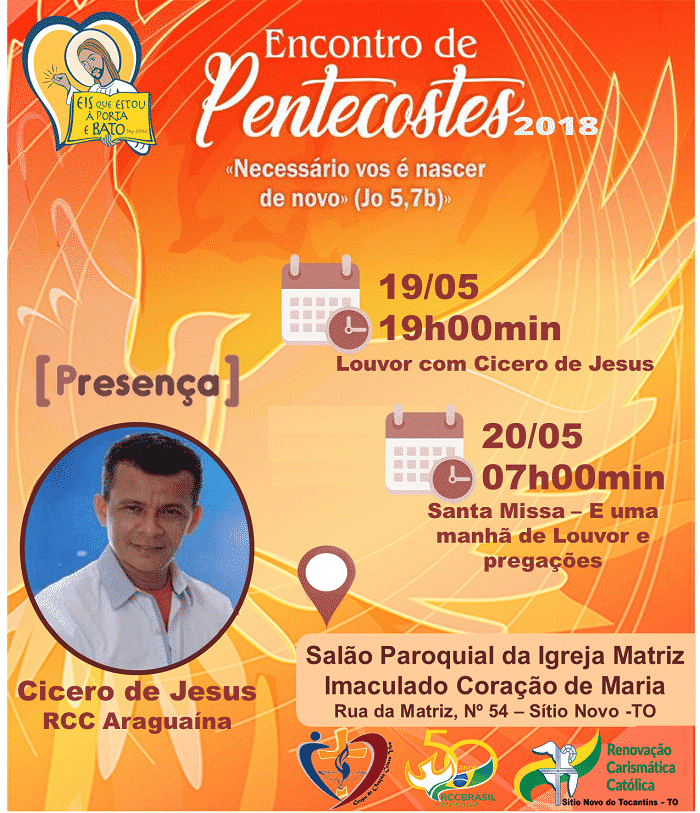 Nos dias 19 e 20 de maio, a Renovação Carismática Católica (RCC), da Paroquia Imaculado Coração de Maria, de Sítio Novo do Tocantins, promove o encontro de Pentecostes, tendo como tema “Necessário vos é nascer de novo” (Jo 5,7b). O evento será realizado no salão paroquial da Igreja Matriz Imaculado Coração de Maria.