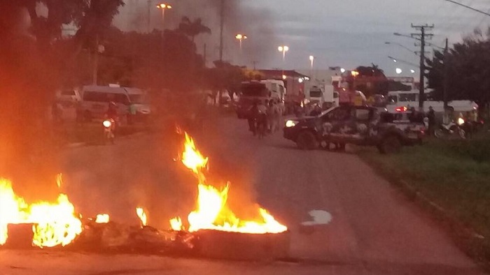 O ato é realizado por um grupo de professores, que entrou em greve na última semana. Os manifestantes chegaram a montar uma barricada na pista com entulhos e pneus queimados.
