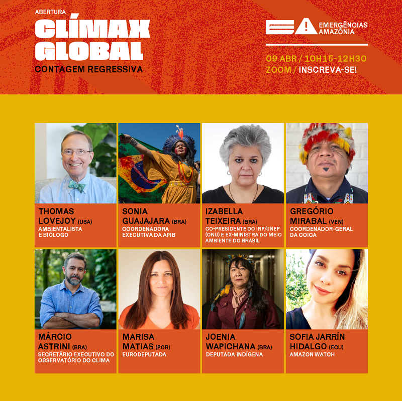 | “Clímax – Contagem regressiva” Mesa de abertura, sexta-feira (09/04), a partir das 10h (UTC-3)Como países e regiões como EUA, União Européia, América Latina e Brasil estão lidando com a emergência climática? Que leituras e recomendações os convidados fazem aos movimentos e organizações da sociedade civil mobilizadas em prol da agenda? Essas são as questões que estarão presentes na mesa de abertura.Convidados: ▪️ Thomas Lovejoy (EUA) – Biólogo e ambientalista ▪️ Sonia Guajajara (@guajajarasonia) – Liderança indígena e coordenadora executiva da APIB ▪️ Izabella Teixeira – Co-presidente do Painel Internacional de Recursos Naturais da ONU e ex-Ministra do Meio Ambiente do Brasil ▪️ Gregório Mirabal (@gregoriom_ayaneni) – Coordenador-geral da COICA ▪️ Márcio Astrini (@marcioastrini) – Secretário executivo do Observatório do Clima ▪️ Marisa Matias (@marisa_matias) – Eurodeputada portuguesa ▪️ Joênia Wapichana (@joeniawapichana) – Deputada federal por Roraima ▪️ Sofia Jarrín Hidalgo – Conselheira da Amazon Watch |