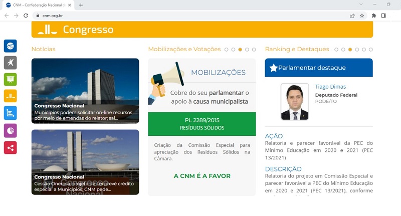 A atuação do deputado federal Tiago Dimas (Podemos-TO) à frente da relatoria da PEC 13 (Proposta de Emenda à Constituição n° 13) fez com que a CNM (Confederação Nacional dos Municípios) apontar o congressista tocantinense como “parlamentar destaque” do municipalismo.