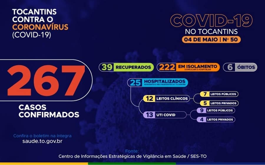 Atualmente, o Tocantins contabiliza 06 óbitos, 39 casos recuperados e 222 pacientes ainda em isolamento domiciliar ou hospitalar.