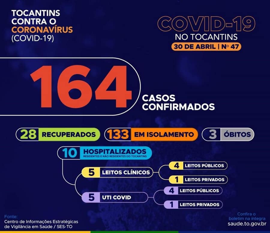 Atualmente, o Tocantins contabiliza 03 óbitos, 28 casos recuperados e 133 em isolamento domiciliar ou hospitalar.