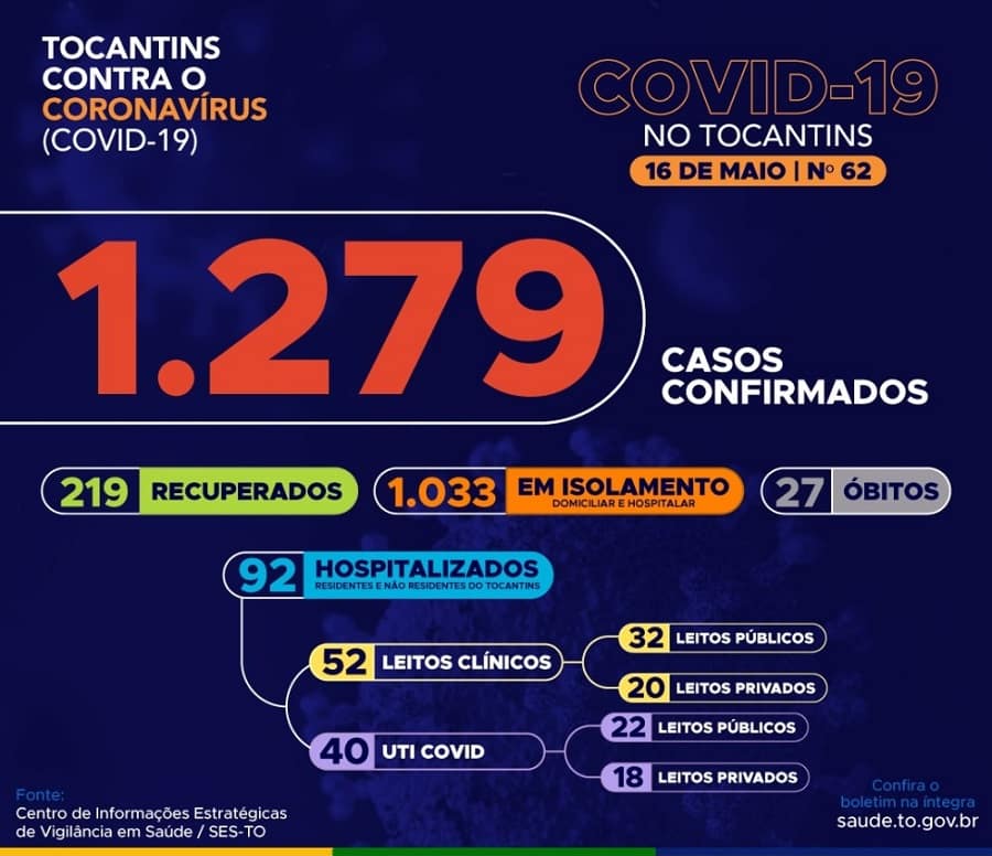 Atualmente, o Tocantins contabiliza 27 óbitos, 219 casos recuperados e 1.033 pacientes ainda em isolamento domiciliar ou hospitalar.