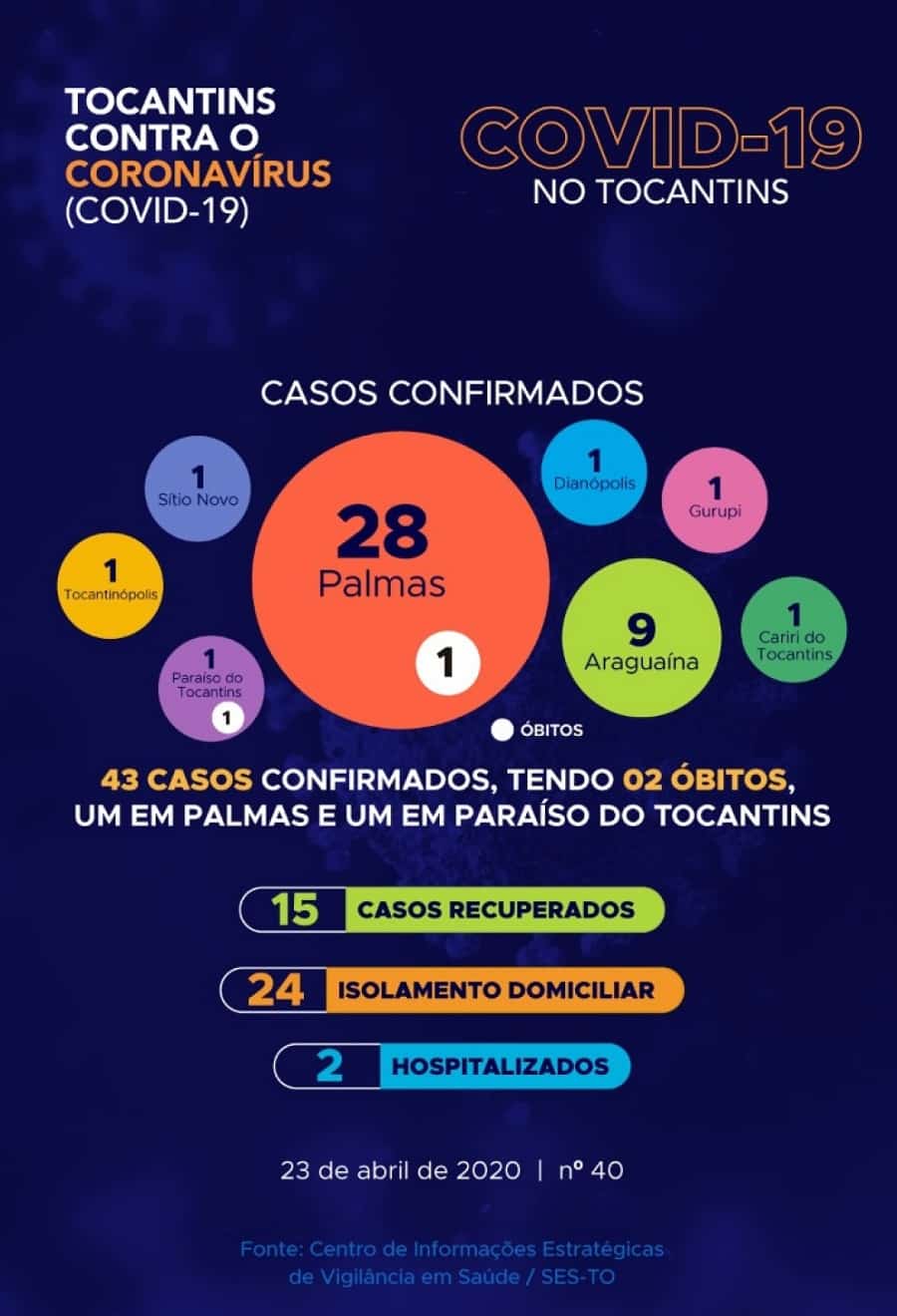 Desta forma, o Tocantins agora contabiliza 43 casos confirmados da Covid-19, nas cidades de Palmas (28), Araguaína (09), Cariri do Tocantins (01), Gurupi (01), Dianópolis (01), Paraíso do Tocantins (01), Sítio Novo (01) e Tocantinópolis (01).