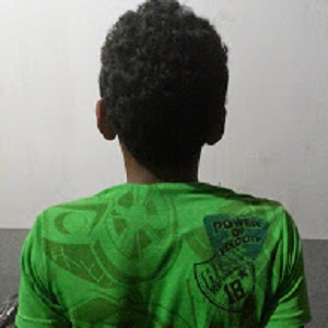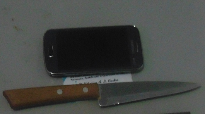 Após essas informações as guarnições de serviço começaram a diligenciar e em menos de 10 minutos, localizaram próximo à praça do Dores, o menor C.F.M de 14 anos, com as mesmas características passadas pela vítima. Após abordagem pessoal, foi encontrado de posse do adolescente uma faca de cabo Tramontina, com 20 cm de comprimento e um aparelho celular Sansung, cor cinza, parecido com o que foi descrito pela vítima.