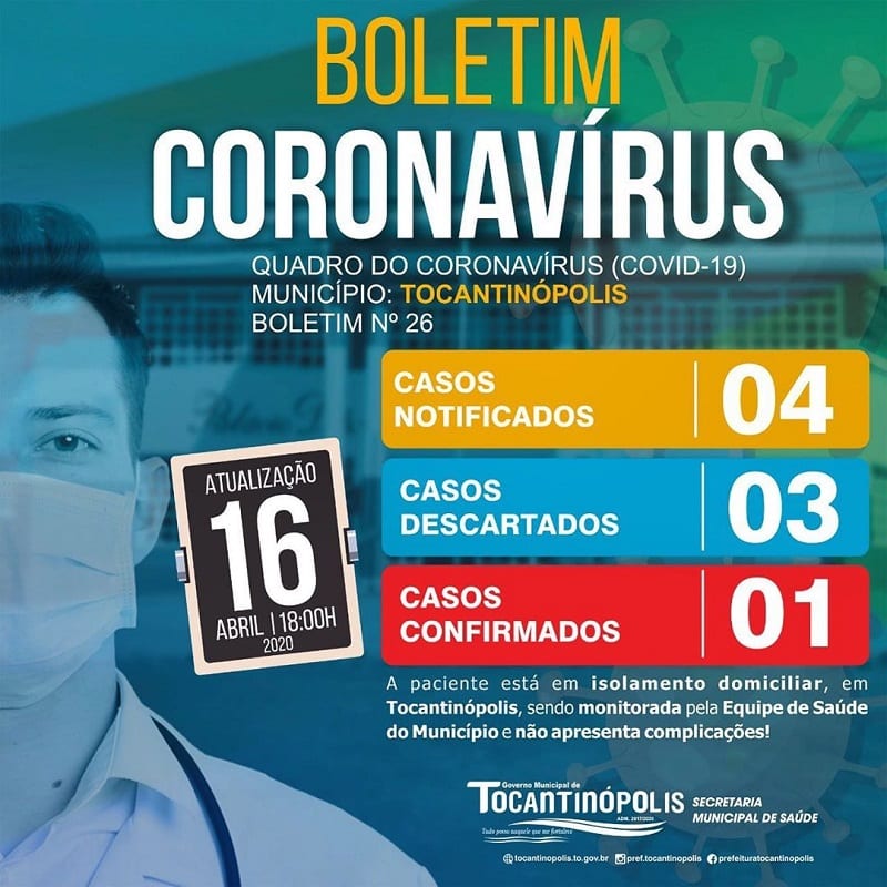 Publicidade Publicidade Bico do Papagaio TOCANTINÓPOLIS: Boletim coronavírus desta quinta, 16 By Folha do Bico 16 de abril de 2020 0 513 Share WhatsAppPrintTelegramFacebookTwitterCopy URL Folha do Bico Noticias Relacionadas TOCANTINÓPOLIS: UFNT abre vagas para graduação pelo SISU 2026/1 15 de janeiro de 2026 ARAGUATINS: Processo seletivo complementar da UNITINS está com inscrições abertas 15 de janeiro de 2026 ESPERANTINA: Escola Família Agrícola Padre Josimo recebe trator e fortalece ensino prático no campo 15 de janeiro de 2026 Share WhatsAppPrintTelegramFacebookTwitterCopy URL Previous articleHospitais privados do MA já anunciam falta e leitos para coronavírusNext articleAUGUSTINÓPOLIS: Boletim coronavírus desta quinta, 16 - Advertisement - - Advertisement - Ultimas noticias SÃO BENTO: Droga e dinheiro são encontrados durante abordagem de meliante no bairro São Francisco 15 de janeiro de 2026 ARAGUATINS: Aquiles recua após conflito com DETRAN e apresenta pacote de medidas para o trânsito 15 de janeiro de 2026 Laurez é “despejado” do Palácio Araguaia 15 de janeiro de 2026 IMPERATRIZ: Prefeitura publica decreto com calendário de feriados e pontos facultativos de 2026 15 de janeiro de 2026