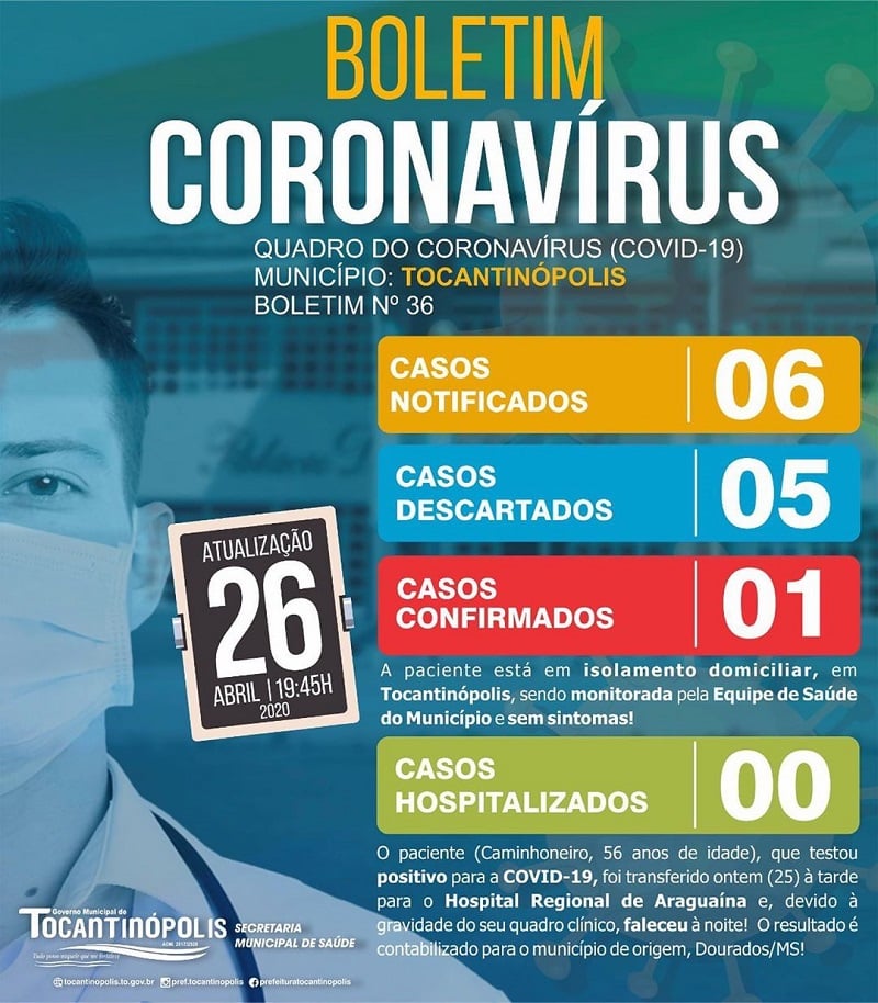 Publicidade Publicidade Bico do Papagaio TOCANTINÓPOLIS: Boletim coronavírus deste domingo, 26 By Folha do Bico 26 de abril de 2020 0 978 Share WhatsAppPrintTelegramFacebookTwitterCopy URL Folha do Bico Noticias Relacionadas TOCANTINÓPOLIS: UFNT abre vagas para graduação pelo SISU 2026/1 15 de janeiro de 2026 ARAGUATINS: Processo seletivo complementar da UNITINS está com inscrições abertas 15 de janeiro de 2026 ESPERANTINA: Escola Família Agrícola Padre Josimo recebe trator e fortalece ensino prático no campo 15 de janeiro de 2026 Share WhatsAppPrintTelegramFacebookTwitterCopy URL Previous articlePalmas, Araguaína e Guaraí apresentam novos casos de coronavírus e TO chega a 67Next articleARAGUATINS: Boletim coronavírus deste domingo, 26 - Advertisement - - Advertisement - Ultimas noticias SÃO BENTO: Droga e dinheiro são encontrados durante abordagem de meliante no bairro São Francisco 15 de janeiro de 2026 ARAGUATINS: Aquiles recua após conflito com DETRAN e apresenta pacote de medidas para o trânsito 15 de janeiro de 2026 Laurez é “despejado” do Palácio Araguaia 15 de janeiro de 2026 IMPERATRIZ: Prefeitura publica decreto com calendário de feriados e pontos facultativos de 2026 15 de janeiro de 2026