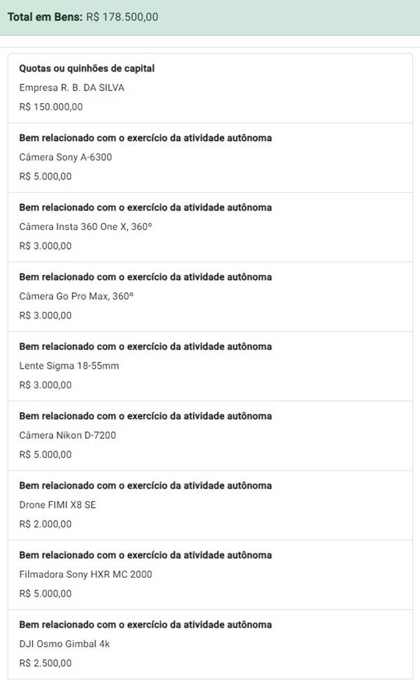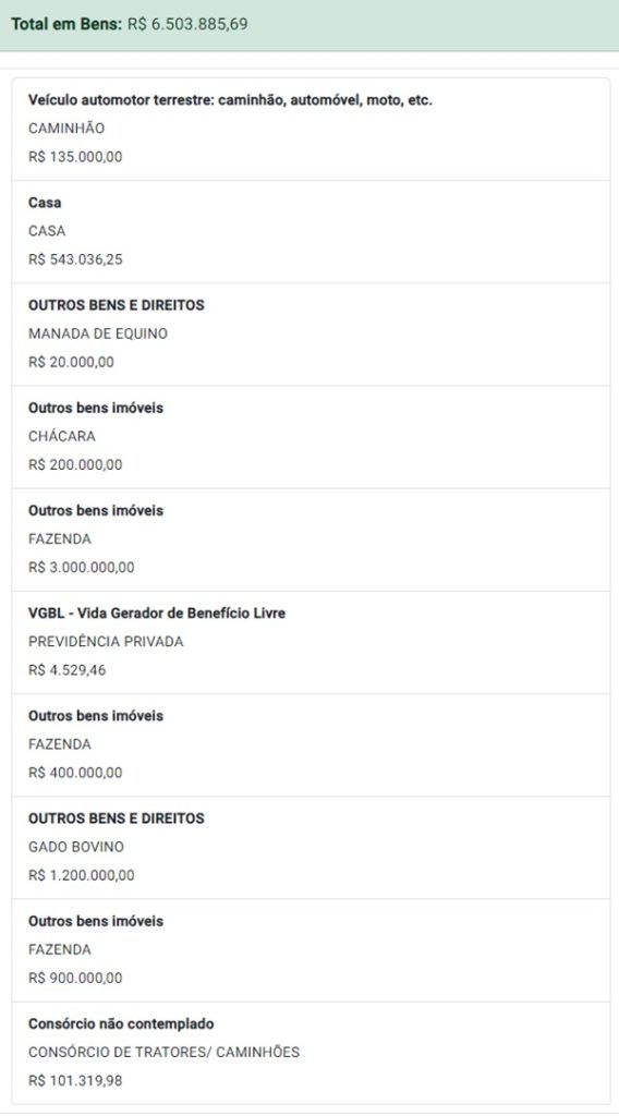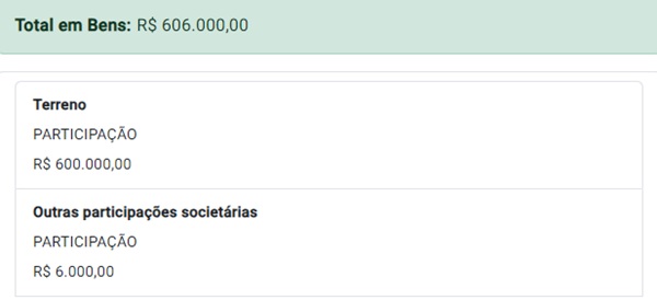As declarações de bens incluem uma variedade de ativos, como imóveis, automóveis, investimentos financeiros, além de saldos em contas correntes e poupança.
