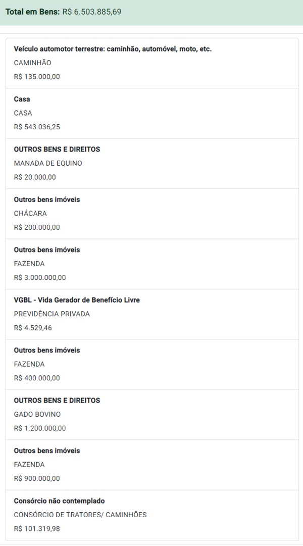 As declarações de bens incluem uma variedade de ativos, como imóveis, automóveis, investimentos financeiros, além de saldos em contas correntes e poupança.