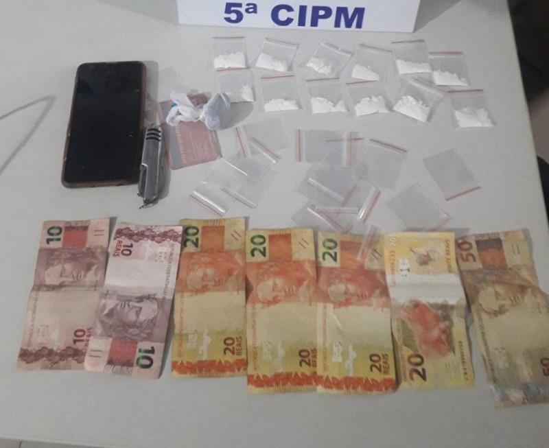 No local, foram localizados vários invólucros com substâncias análogas à cocaína e uma porção de maconha. Ainda, dentro da bolsa foi localizada uma quantia de R$ 150,00, em espécie, além de um canivete.