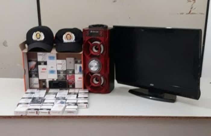 Em diligências, os militares localizaram um menor de idade, suspeito, que estava em posse de cigarros, uma TV Led, uma caixa de som e de um celular. Ele confessou a autoria do furto e ainda apontou onde estaria seu comparsa, que também foi localizado pela PM. Com este havia 13 carteiras de cigarros.