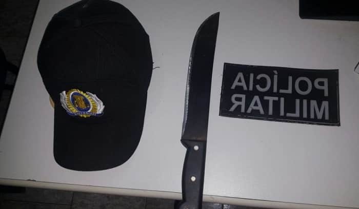 Os militares foram informados via denúncia que um homem, em posse de uma faca, ameaçava pessoas nas proximidades de uma igreja, no centro da cidade. No local, a denúncia foi constatada, pois o homem estava ameaçando às pessoas, que transitavam pelo local, a lhe darem dinheiro. O autor portava uma faca de 12 polegadas.