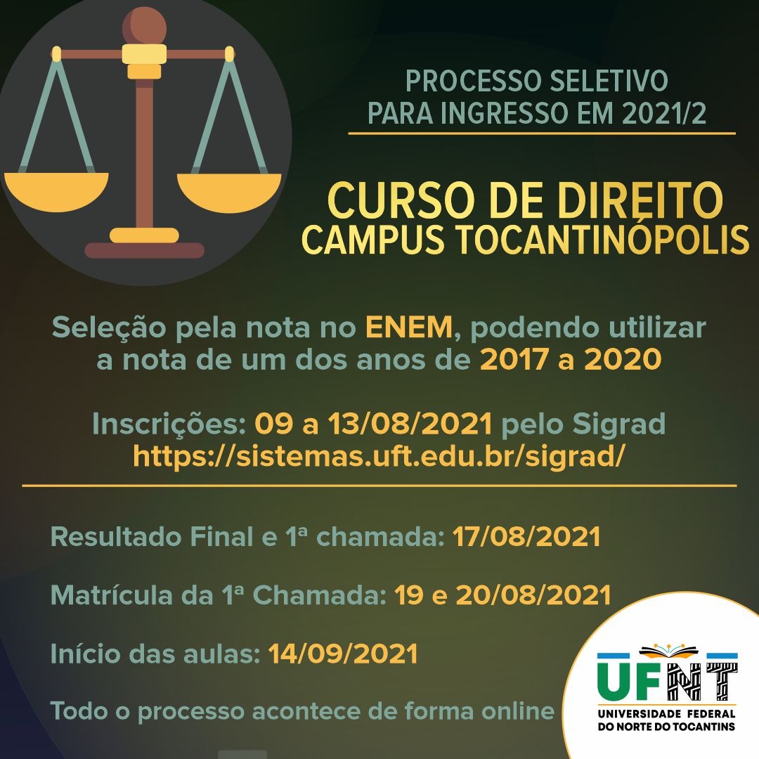 A UFNT abriu inscrições para o Processo Seletivo do curso de Direito, em Tocantinópolis. São 40 vagas para ingresso em 2021/2. A seleção é feita pela nota no Enem, podendo utilizar a nota de um dos anos de 2017 a 2020.