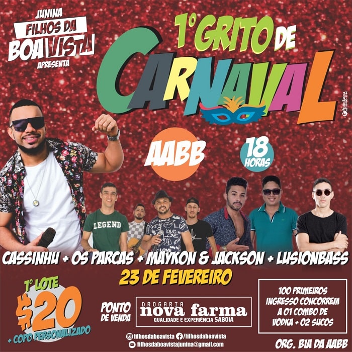 Visando angariar recursos para participação em festivais regionais de quadrilha, a Junina Filhos da Boa Vista, de Tocantinópolis, promove neste sábado, dia 23 de fevereiro, o 1º Grito de Carnaval. A festa carnavalesca, que misturará vários ritmos musicais como: samba, pagode, forró, sertanejo, swingueira e funk, acontece na Associação Atlética do Banco do Brasil (AABB), a partir das 18h.