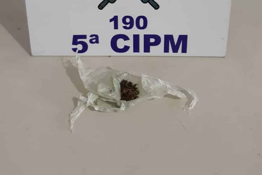 A Guarnição deslocou imediatamente ao endereço informado, deparando-se com acusado. Ele foi abordado e submetido a uma busca pessoal, onde foi encontrada uma quantia de uma substancia análoga a maconha enrolada em pedaço de sacola, no bolso do short do indivíduo.