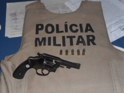 Com o adolescente J.F.S., 17 anos, a polícia encontrou um revólver calibre 32, marca INA, municiado com cinco cartuchos intactos. O jovem foi encaminhado, juntamente com seu genitor, à Delegacia Especial da Criança e do Adolescente para os procedimentos cabíveis. (Da Assessoria Ascom PM)