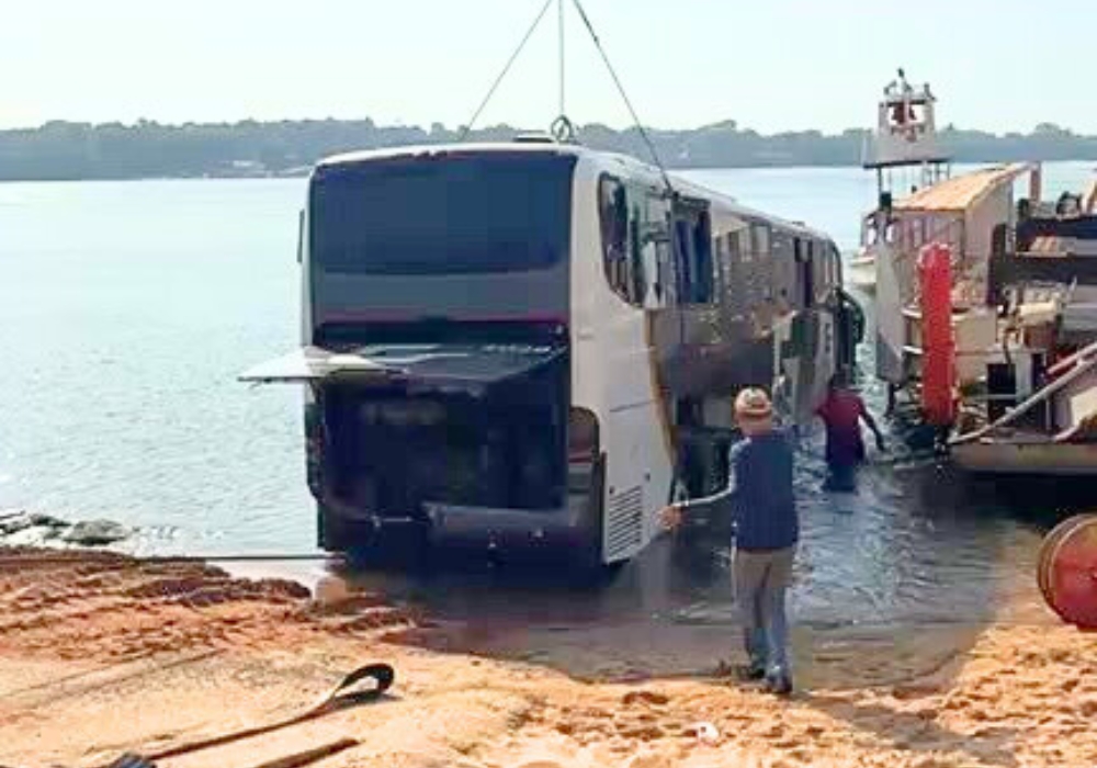 A remoção foi coordenada pela empresa responsável pelo transporte e pela Pipes, concessionária que administra a balsa na cidade. As imagens registradas durante o resgate mostram o momento em que o ônibus foi içado com o auxílio de cabos de aço presos ao eixo e ao chassi, sendo posteriormente rebocado até a margem do rio. O trabalho contou com o apoio de um guincho de grande porte e uma carregadeira para garantir estabilidade e segurança durante a operação.