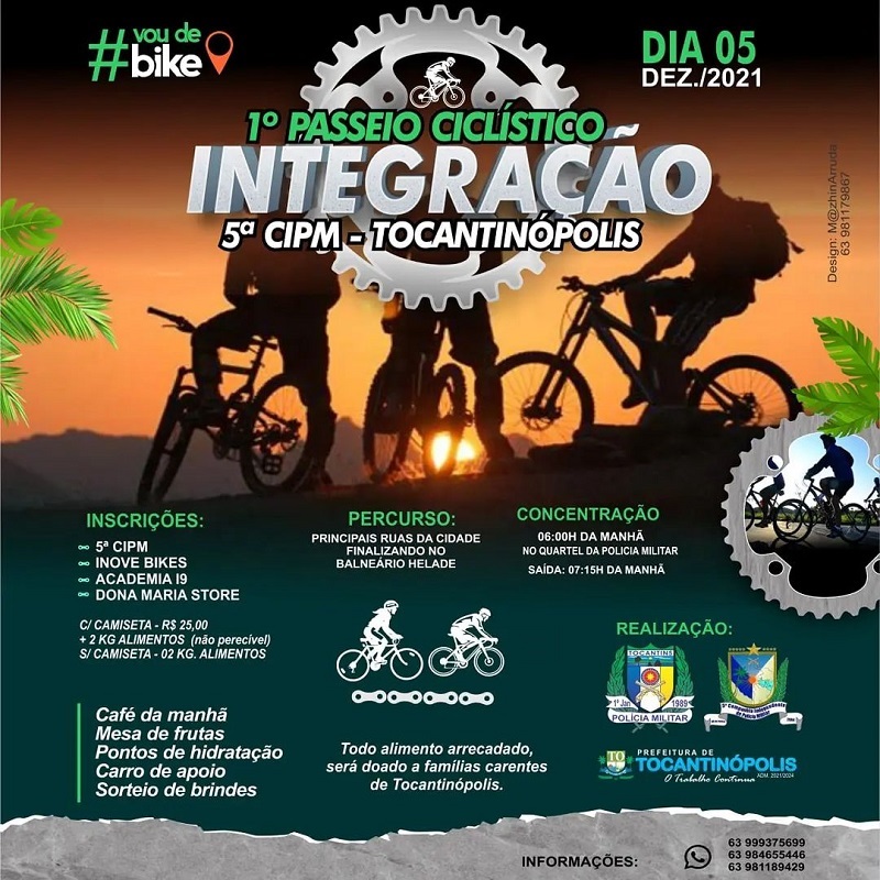 Acontece em dezembro o 1° Passeio Ciclístico Integração – 5ª CIPM. O evento é familiar e acontece no dia 5. Os interessados em participar podem se inscreverem pagando uma taxa de R$ 25,00 + 2kg de alimentos (com camiseta) ou 2 kg de alimentos (sem camiseta).