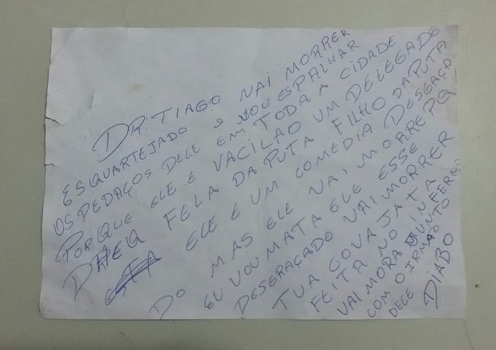 No bilhete, a mensagem dizia: “Dr. Tiago vai morrer esquartejado e vou espalhar os pedaços dele em toda a cidade, porque ele é vacilão, um delegado filho da puta. Ele é um comédia desgraçado, mas ele vai morrer porque eu vou matar ele. Esse desgraçado vai morrer. Tua cova já tá feita no inferno, vai mora [SIC] junto com o irmão dele, diabo”.