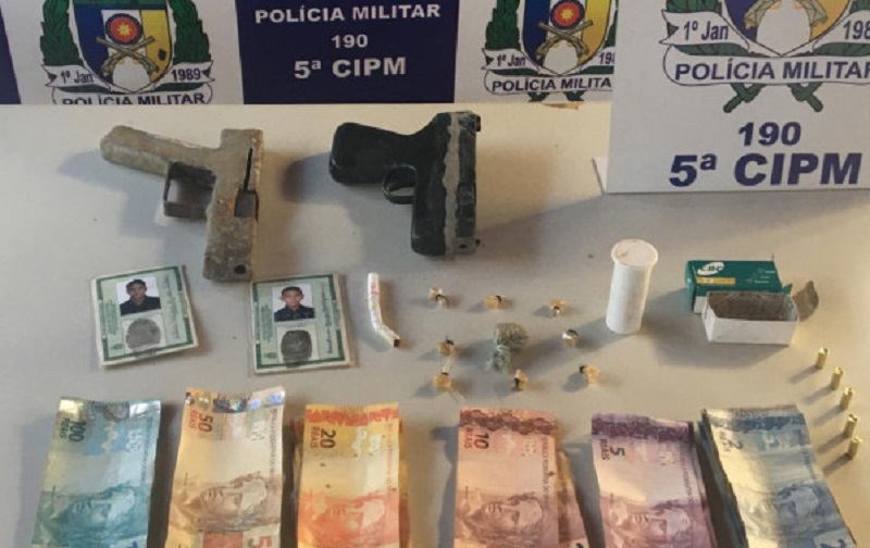 Na abordagem, foram localizadas duas armas de fogo de fabricação caseira – tipo garrucha calibre .22, cinco cápsulas de munições deflagradas, nove pedras de craque e R$ 303,35 em espécie.
