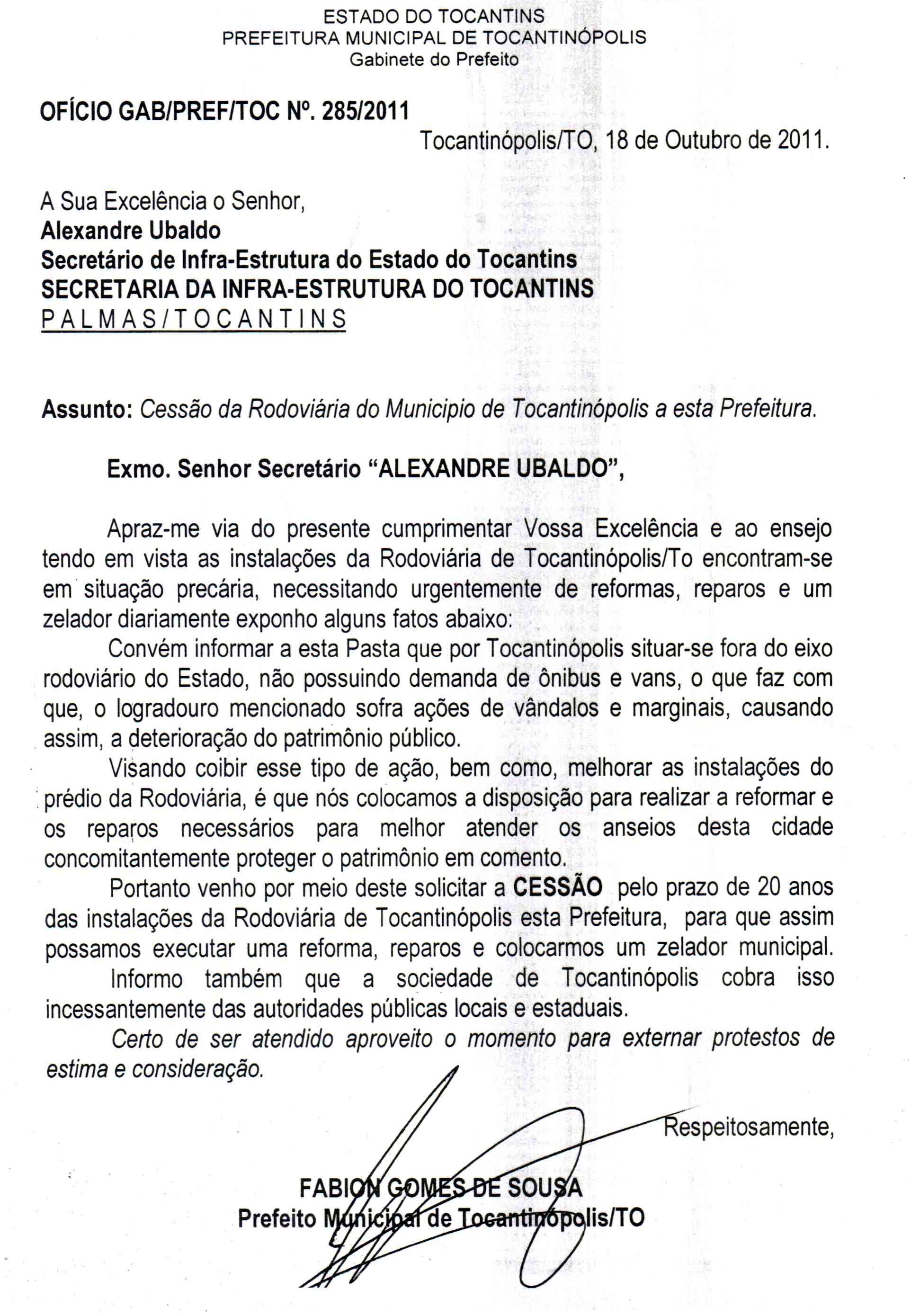 Por meio do documento OFICIO GAB/PREF/TOC Nº.285/2011 de 18 de outubro de 2011 a Prefeitura de Tocantinópolis cobrou do Governo do Estado, junto ao secretário de infra-estrutura, Alexandre Ubaldo, a urgente reforma, reparo e contratação de um zelador. O prefeito Fabion Gomes solicitou ainda a cessão pelo prazo de 20 anos das instalações do terminal rodoviária, para que a Prefeitura assuma todas as responsabilidades na execução de reforma e reparos.
