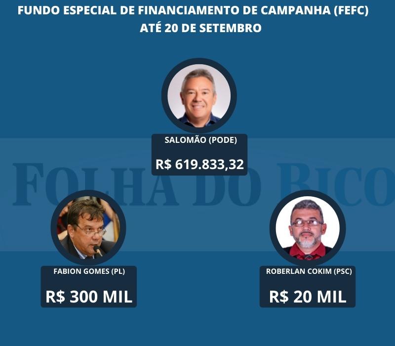 O candidato Salomão do Alziro Gomes (PODE), é o campeão no recebimento do Fundão, com R$619.833,32. Eles gastou a maior parte o dinheiro com a locação de veículos, assessoria jurídica, contábil e em comunicação.