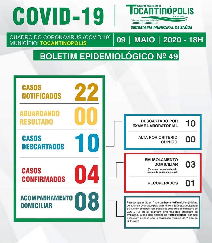 Ainda na sexta, 9, os municípios de Tocantinópolis e Axixá, no Bico do Papagaio, anunciaram novos casos de coronavírus (Covid-19). Tocantinópolis passou de 3 para 4 e Axixá de 3 para 10.