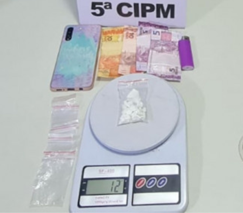 No momento que perceberam a aproximação da guarnição, o condutor acelerou o veículo e a mulher, que estava na traseira da moto, desfazia-se de objetos na pista. Ao adentrarem em uma área de zona rural, o condutor perdeu o controle e ambos caíram do veículo onde o homem conseguiu fugir a pé pelo matagal. Ao passar por busca pessoal, foi localizado no bolso da autora, um embrulho contendo 12 gramas de cocaína, nove embalagens para separar o entorpecente, R$ 40,00 em espécie e um aparelho celular. A motocicleta, também foi apreendida.